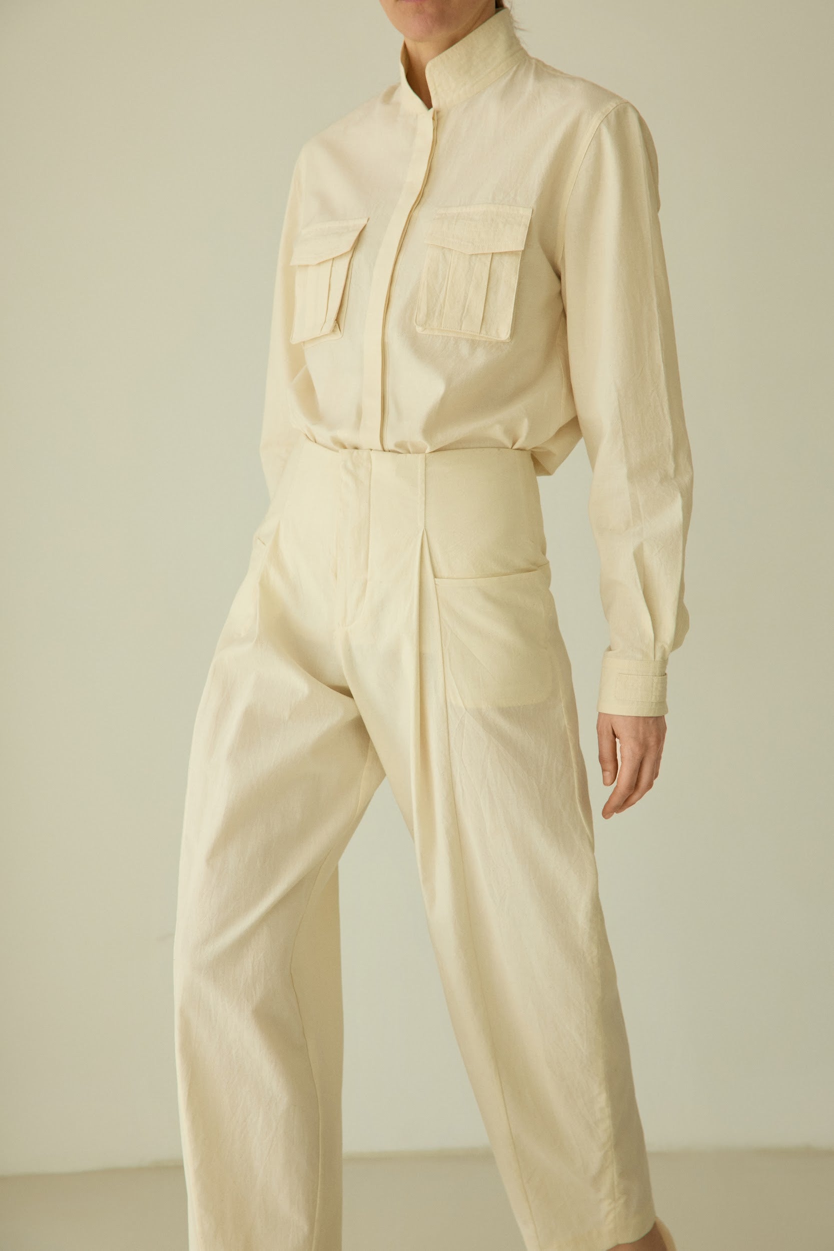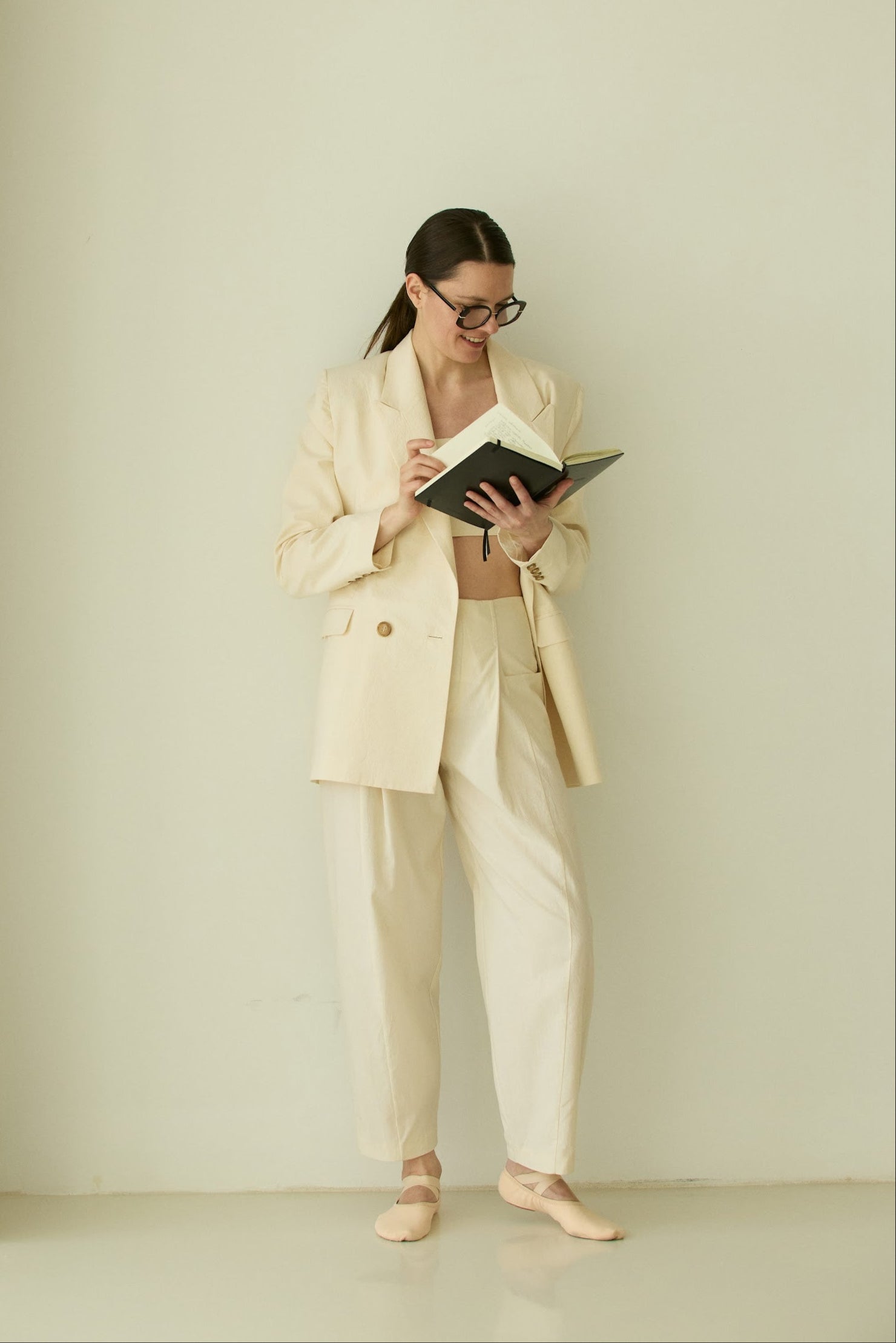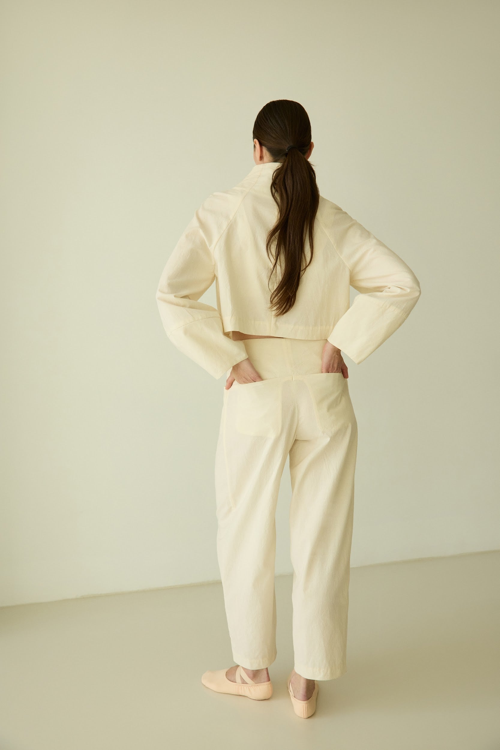 ANDY es un pantalón modular que se construye a partir de una costura en cadera de la que nacen todos sus componentes, incluyendo los bolsillos delanteros y de la espalda. Su ubicación está estudiada para lograr hacer las transformaciones de patrón prescindiendo de pinzas, lo que da como resultado un pantalón de corte muy limpio. Es un pantalón muy cómodo que a su vez se transforma en la perfecta prenda para un evento más formal a través del estilismo y complementos.