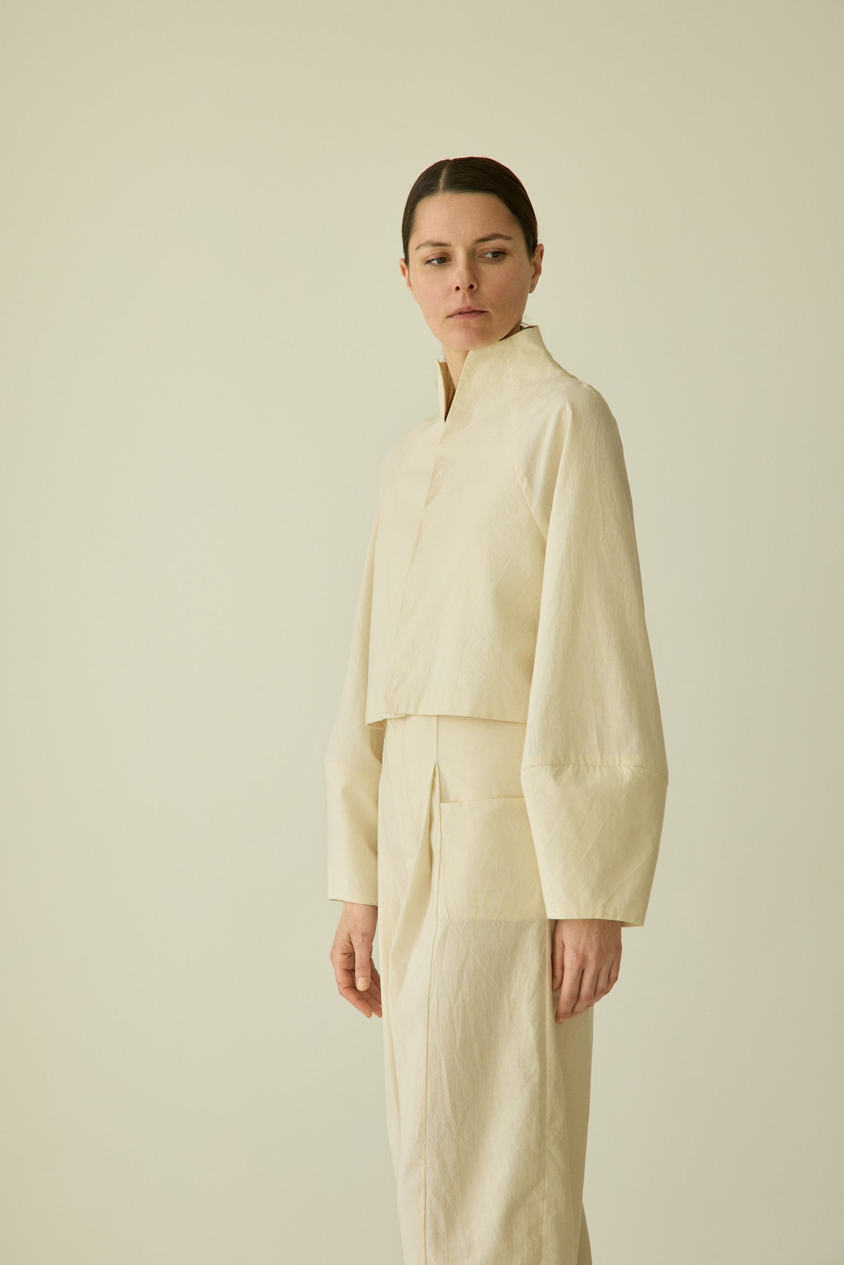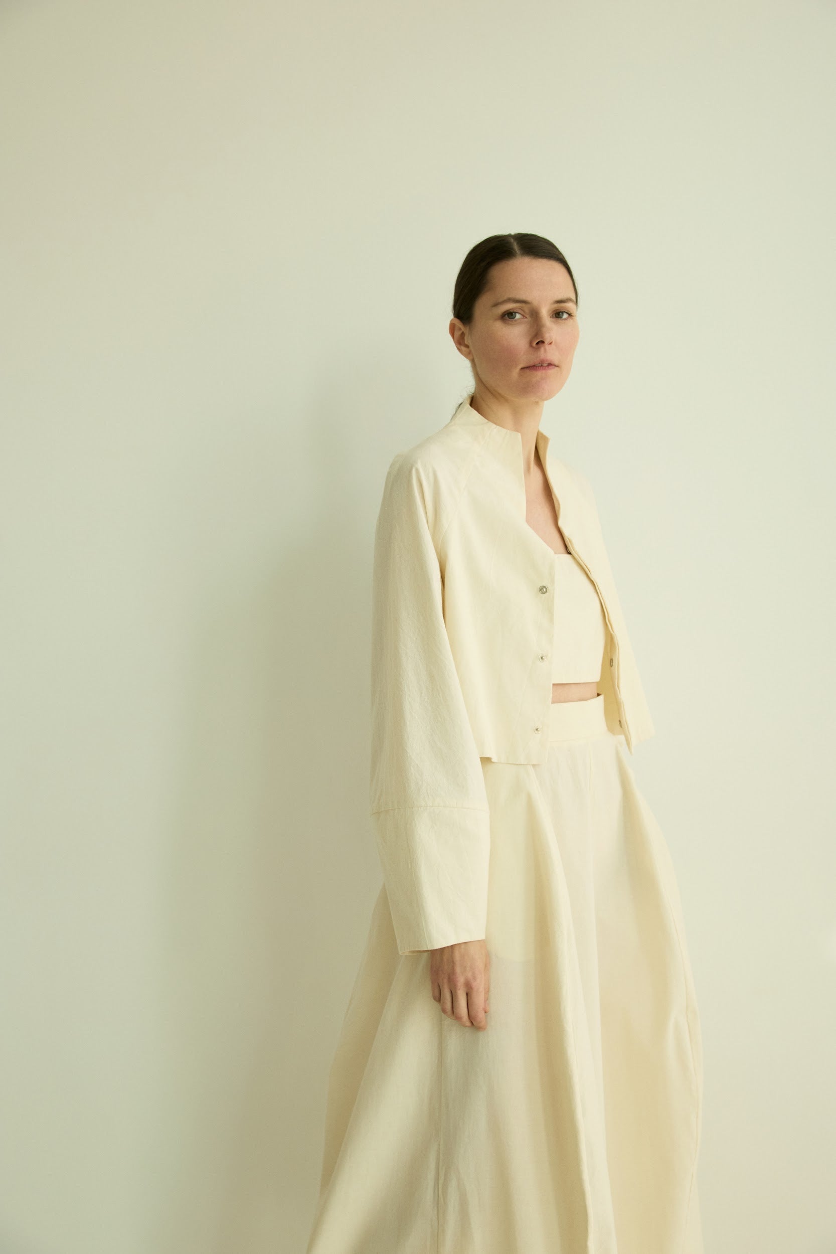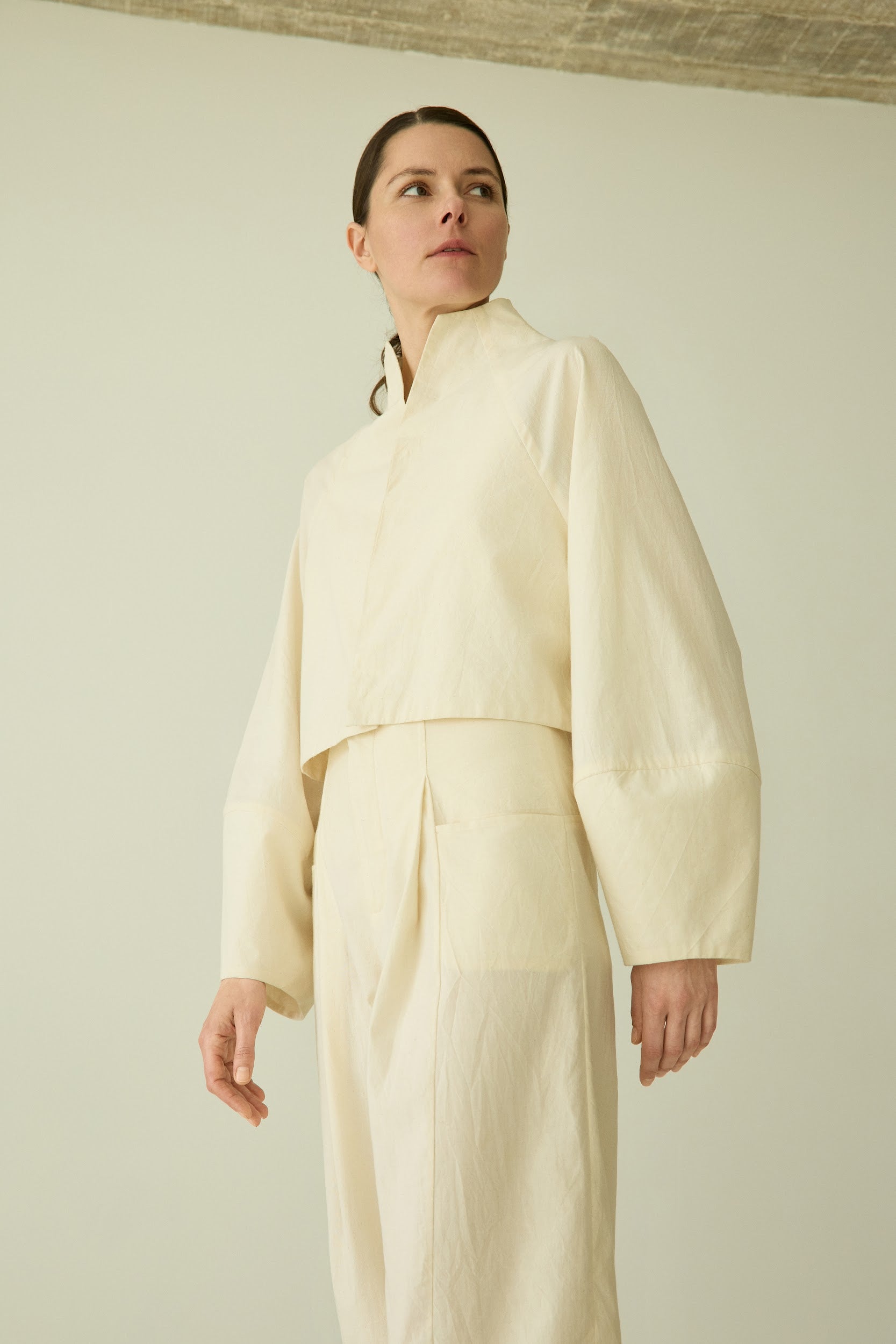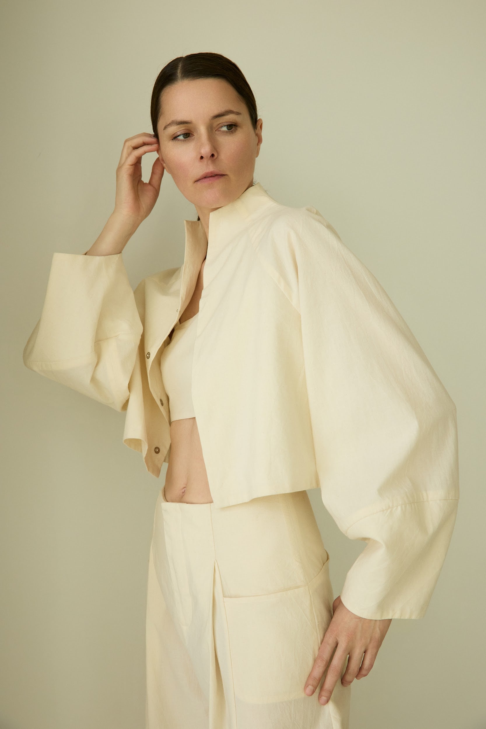 La chaqueta BALLOON parte de la silueta de una sobrecamisa y la reinterpreta con un gesto rotundo: la manga globo. Su volumen contenido y su patrón limpio dan lugar a una prenda corta, estructurada y ligera que funciona como complemento natural del pantalón ANDY y la falda BALLOON.