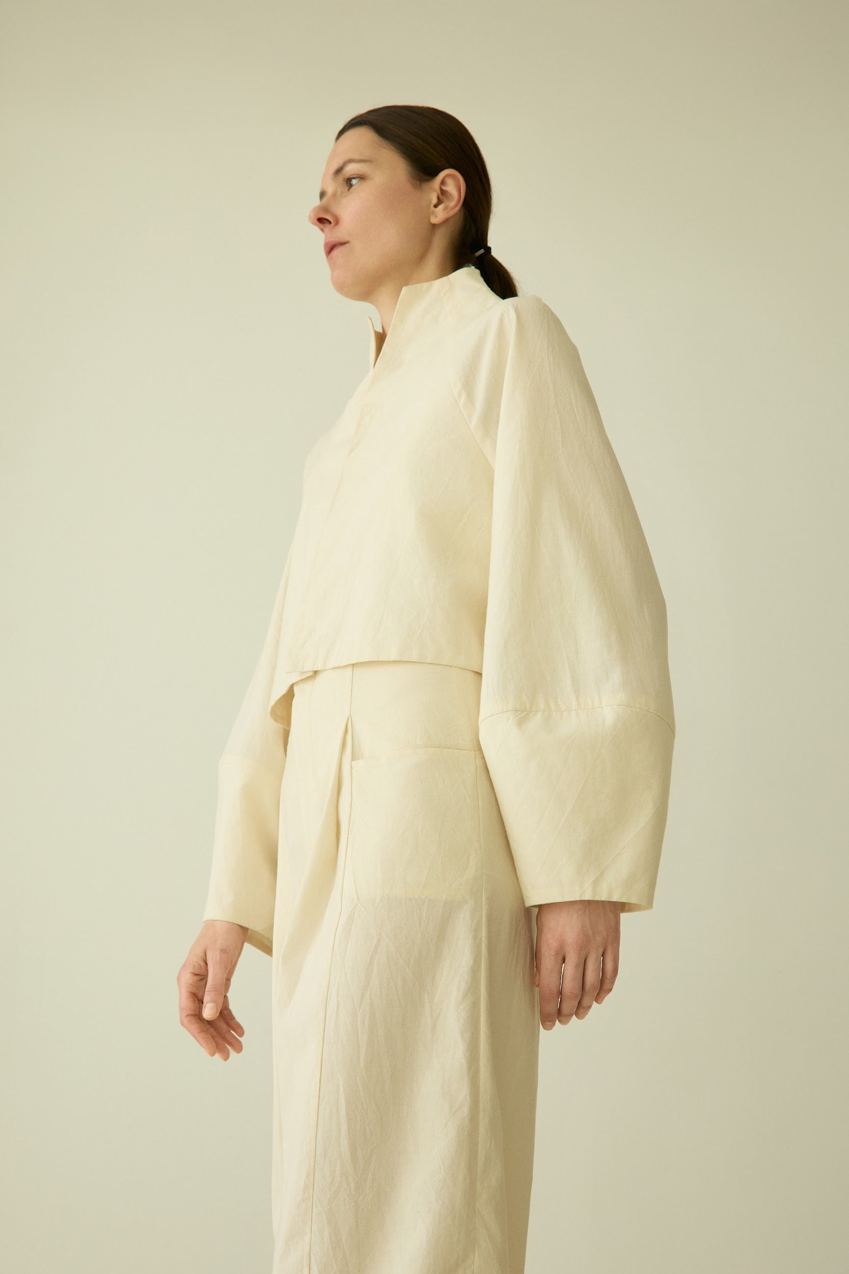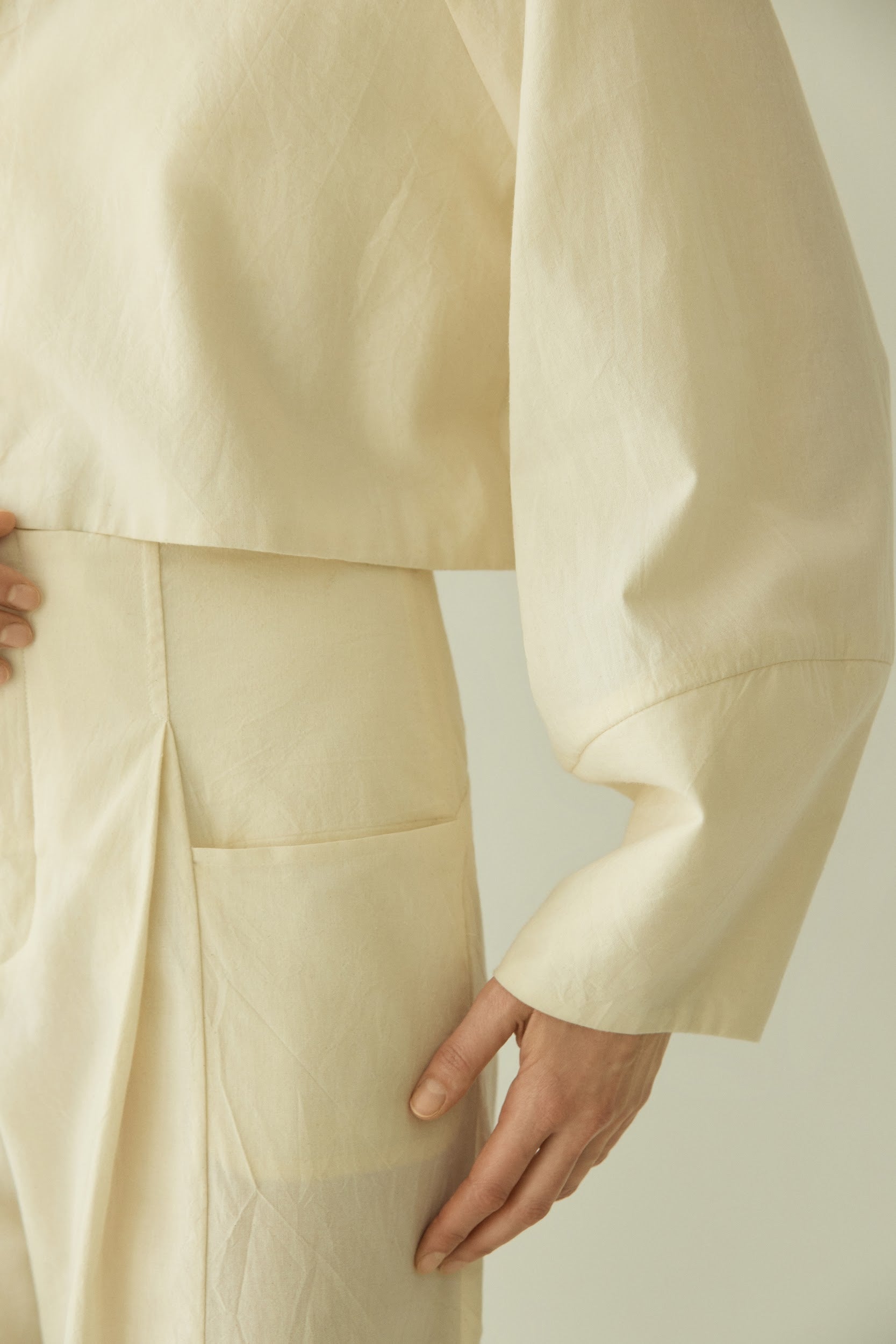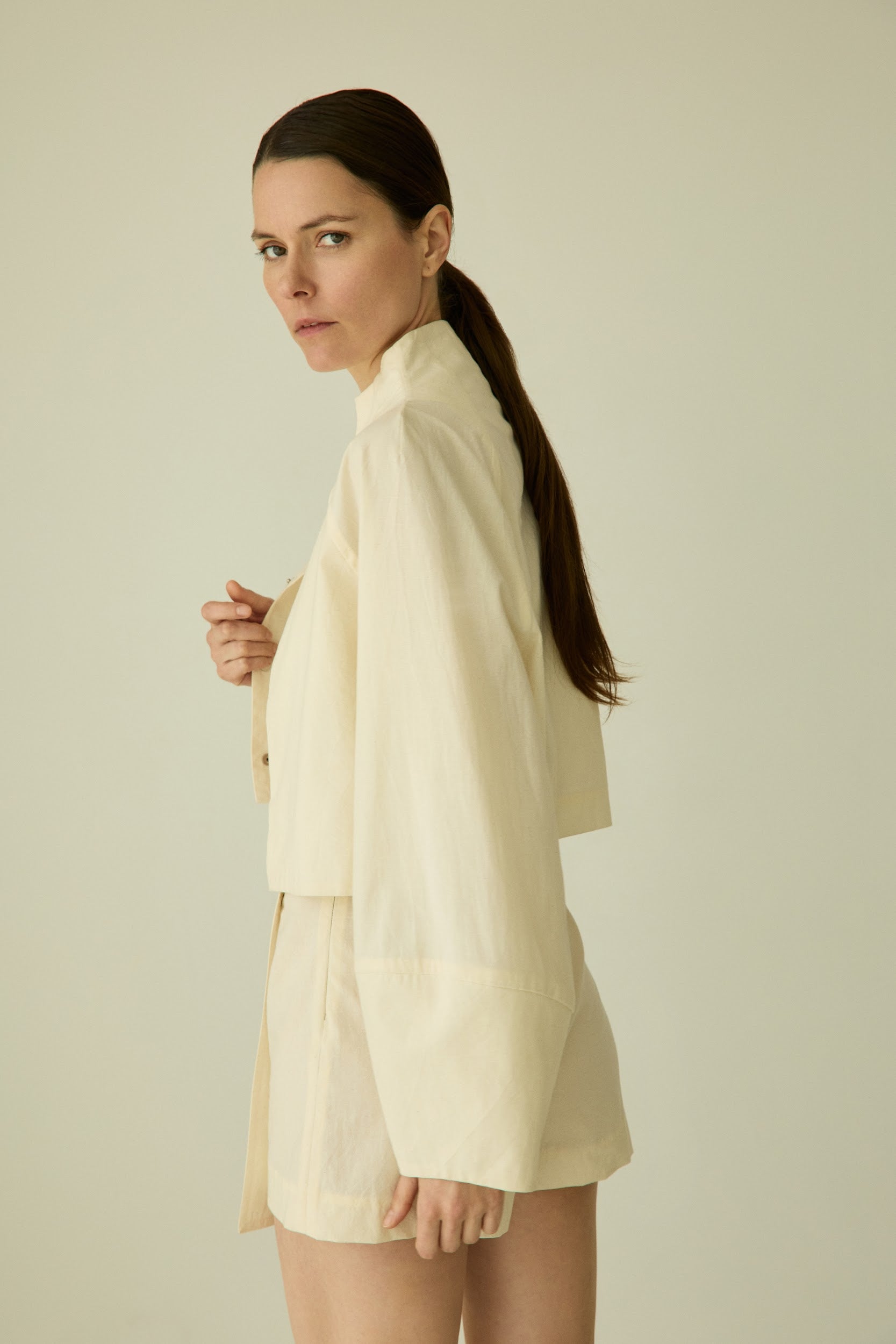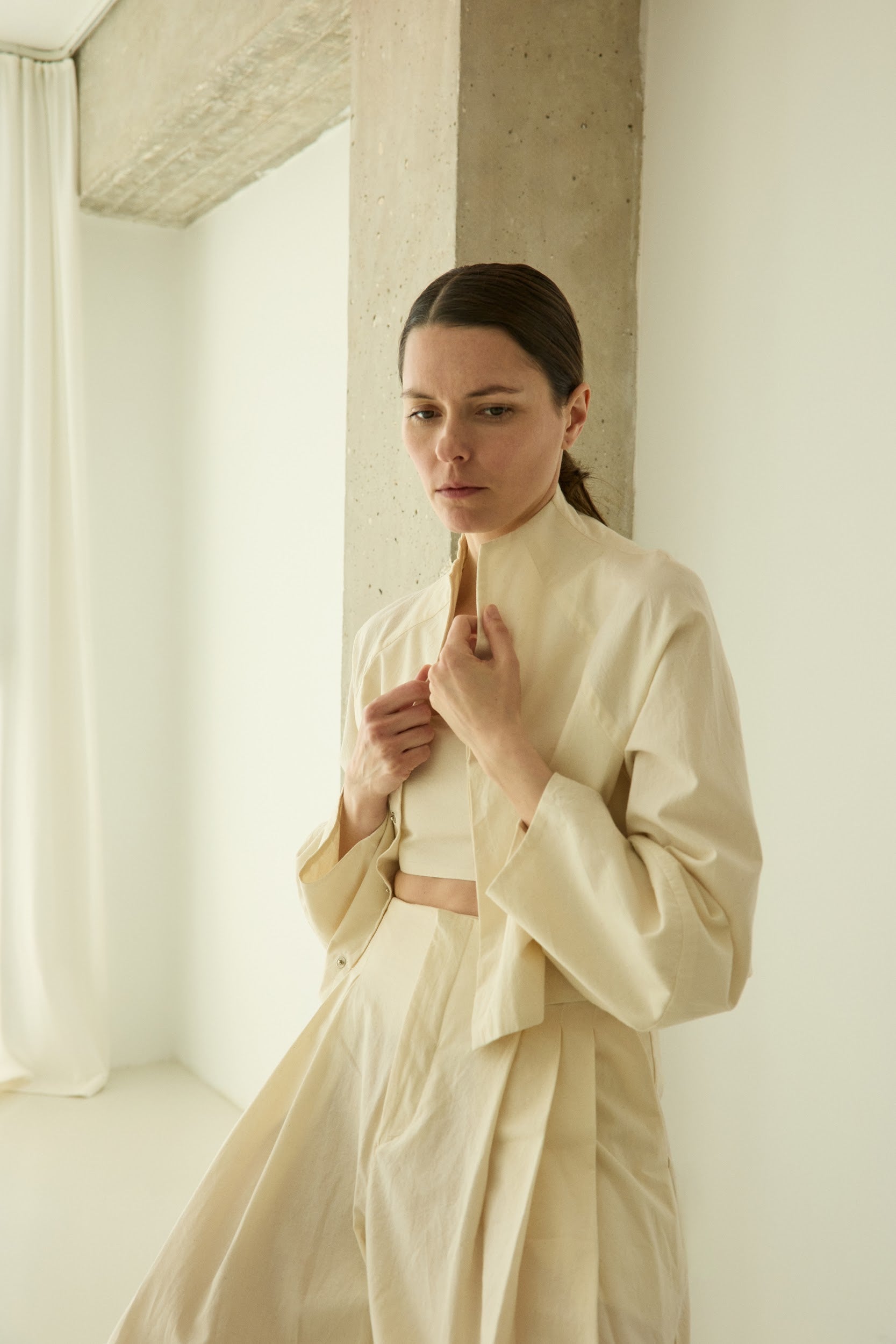 La chaqueta BALLOON parte de la silueta de una sobrecamisa y la reinterpreta con un gesto rotundo: la manga globo. Su volumen contenido y su patrón limpio dan lugar a una prenda corta, estructurada y ligera que funciona como complemento natural del pantalón ANDY y la falda BALLOON.