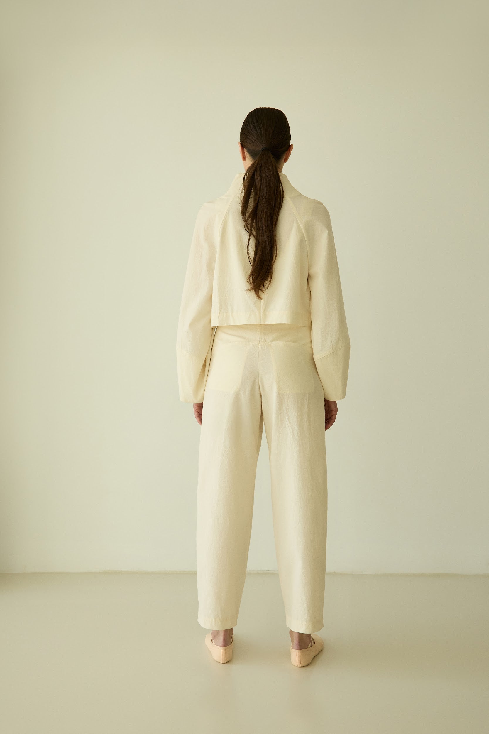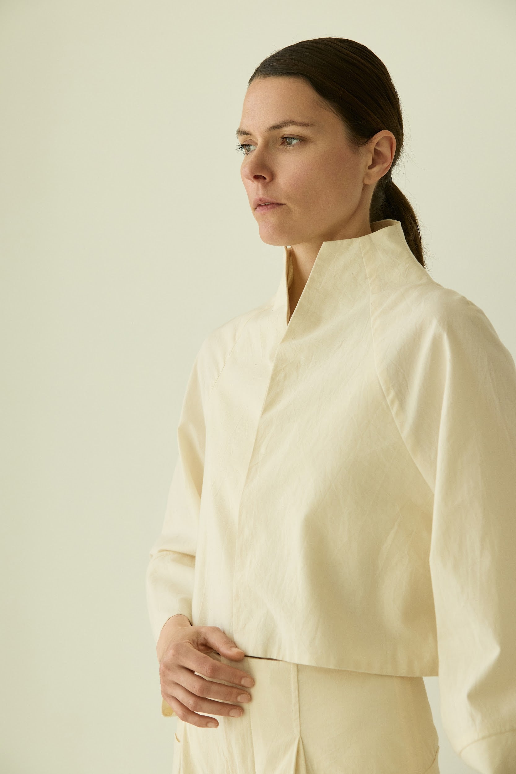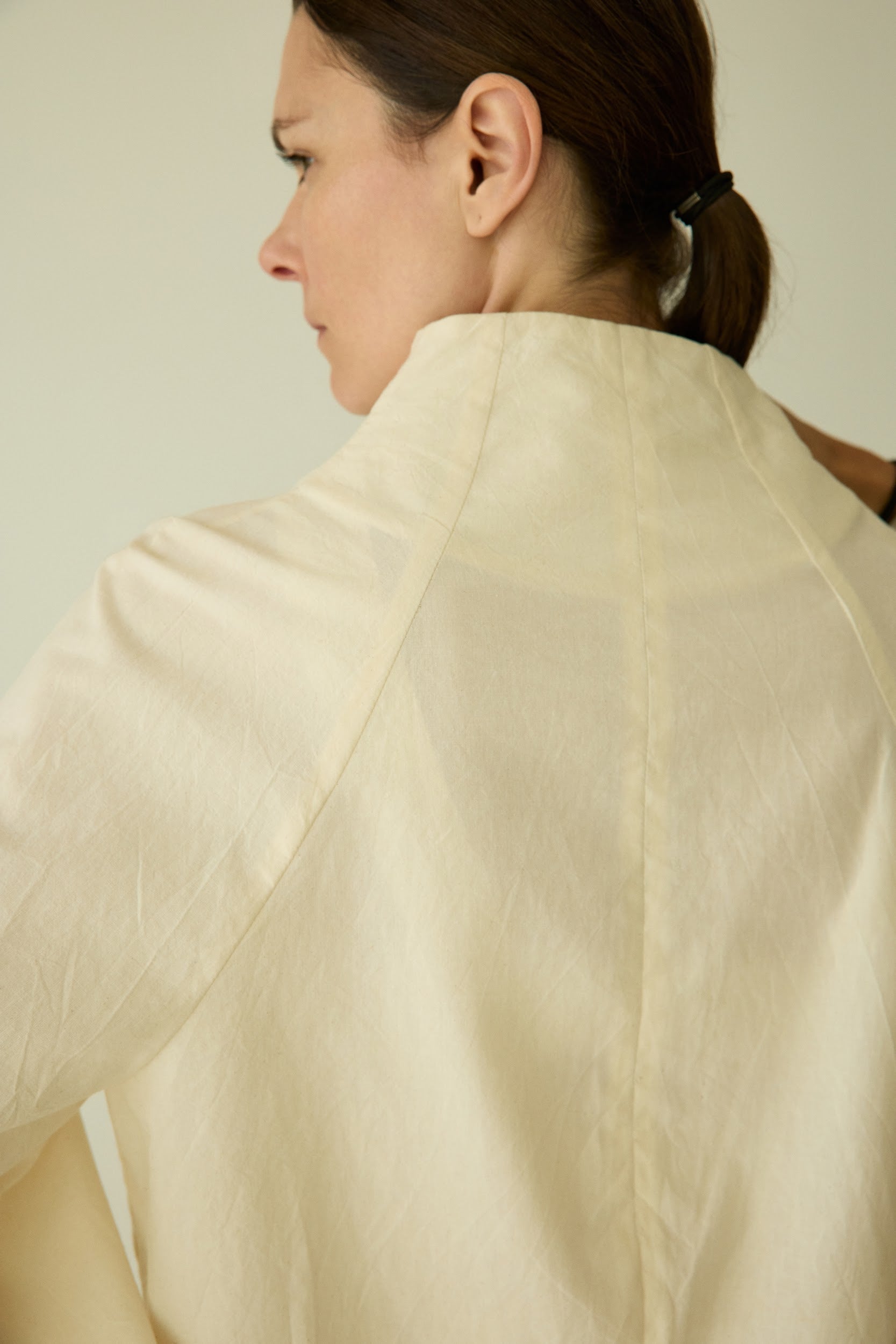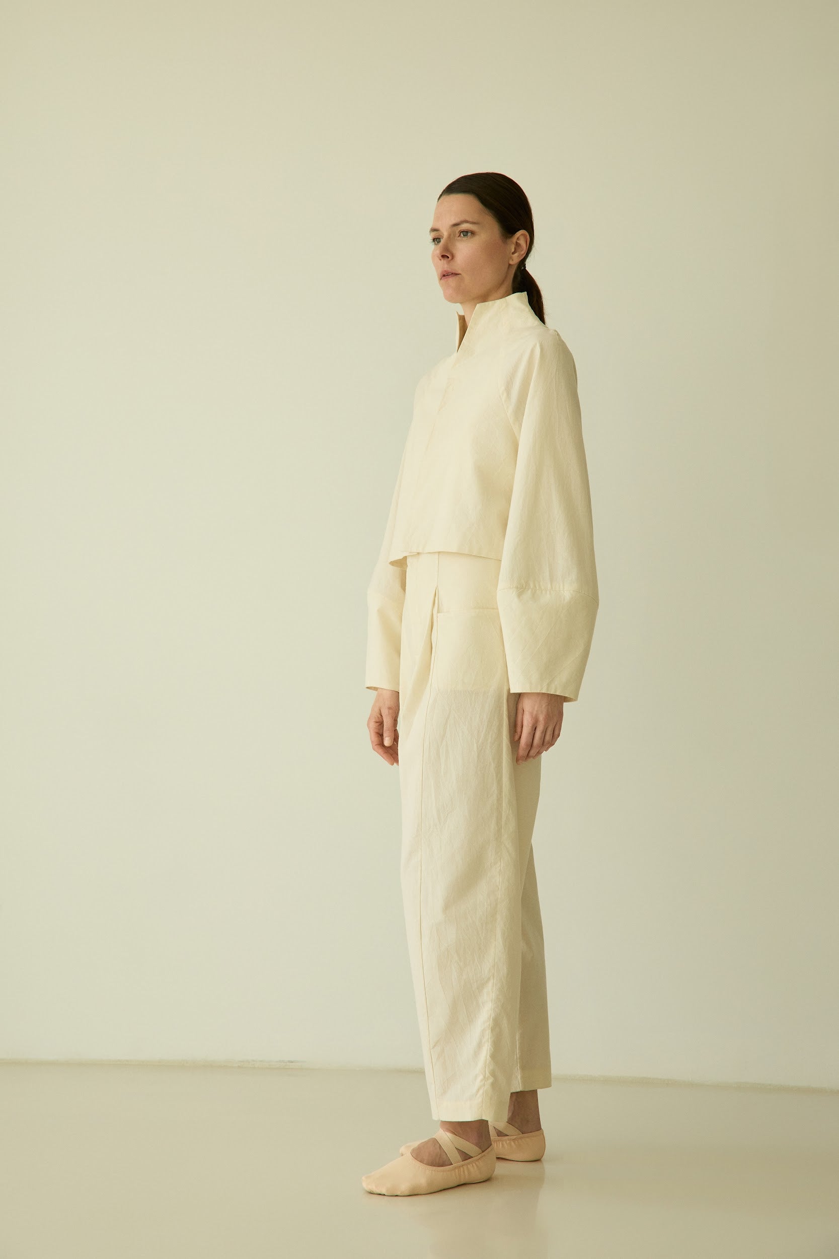 La chaqueta BALLOON parte de la silueta de una sobrecamisa y la reinterpreta con un gesto rotundo: la manga globo. Su volumen contenido y su patrón limpio dan lugar a una prenda corta, estructurada y ligera que funciona como complemento natural del pantalón ANDY y la falda BALLOON.