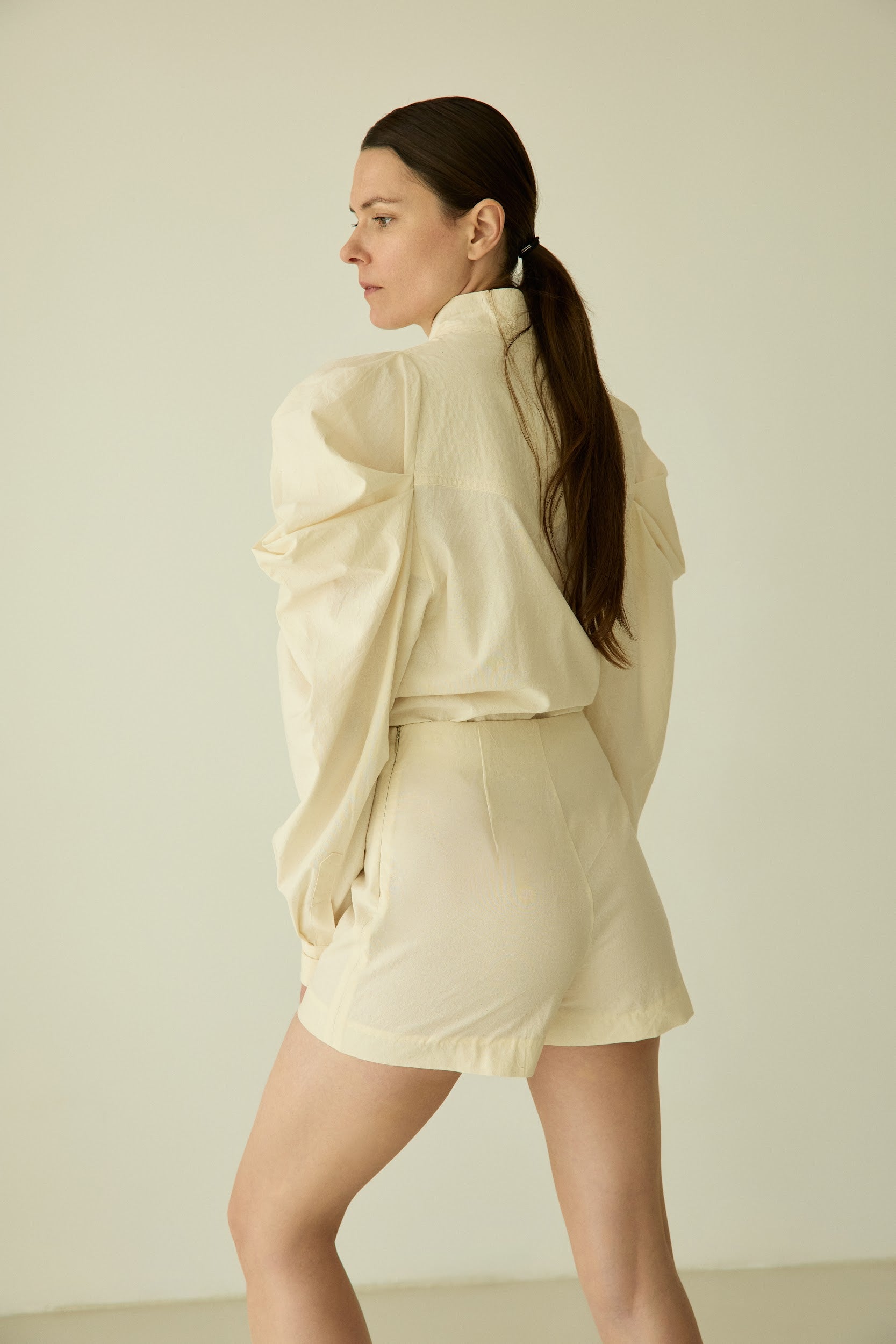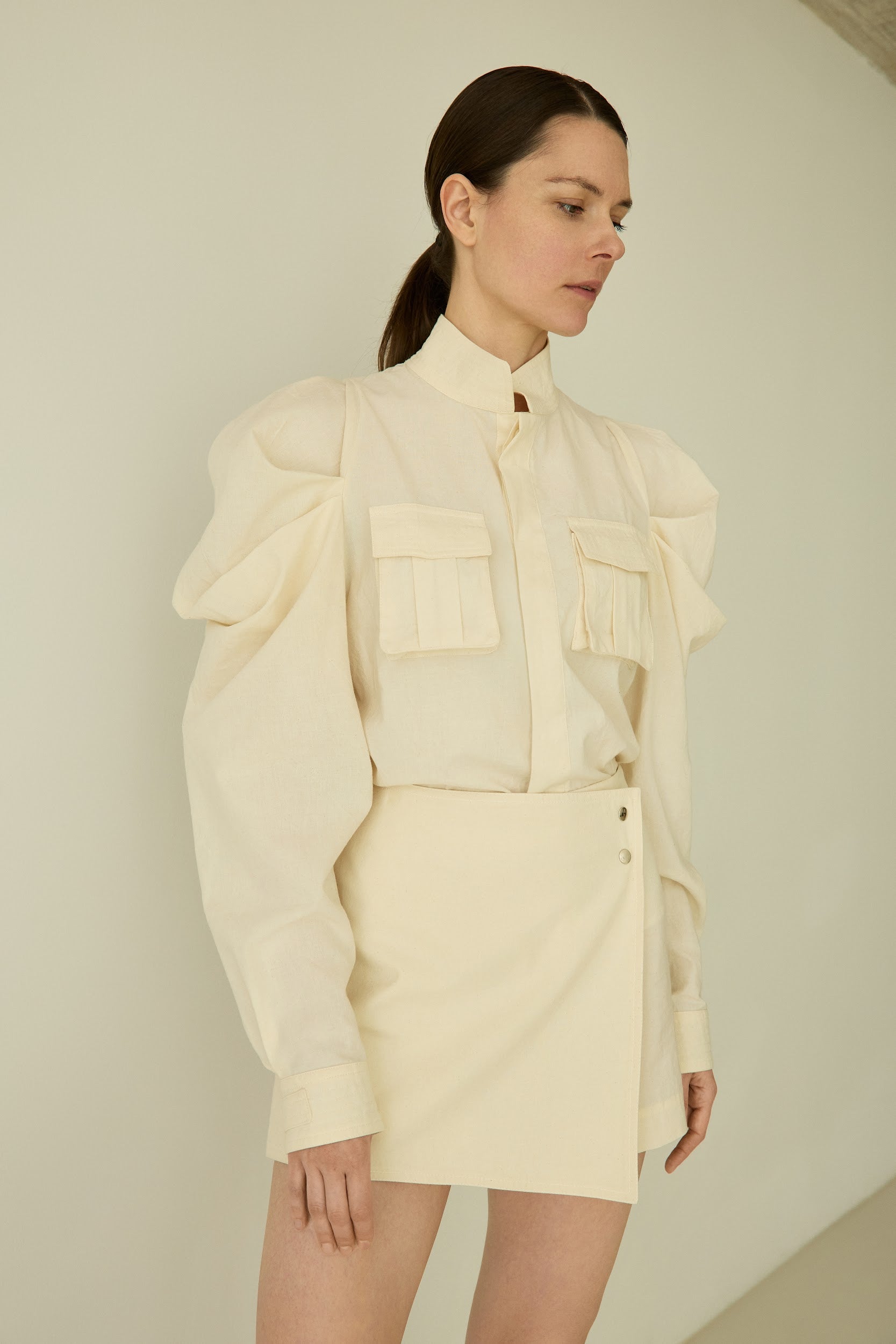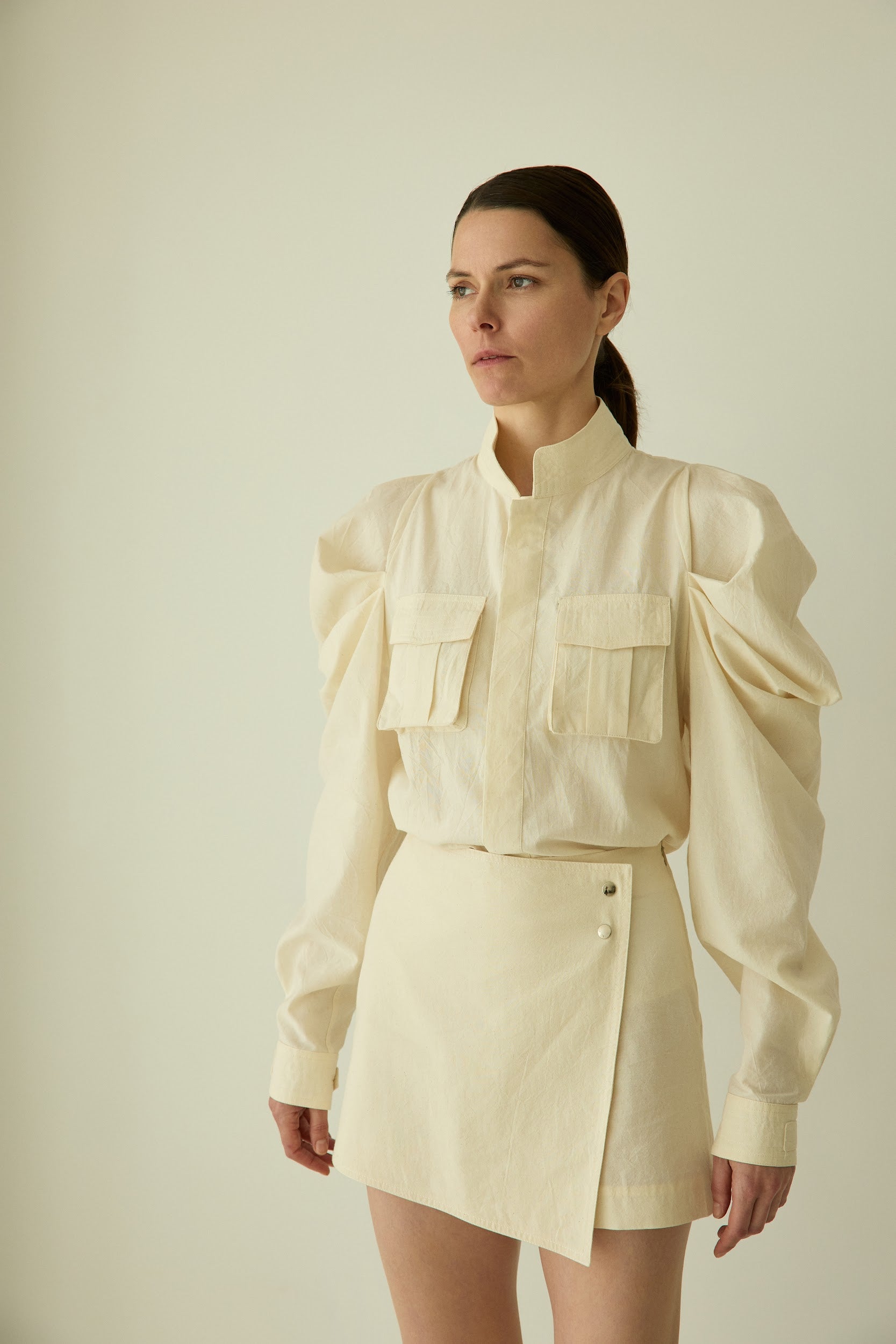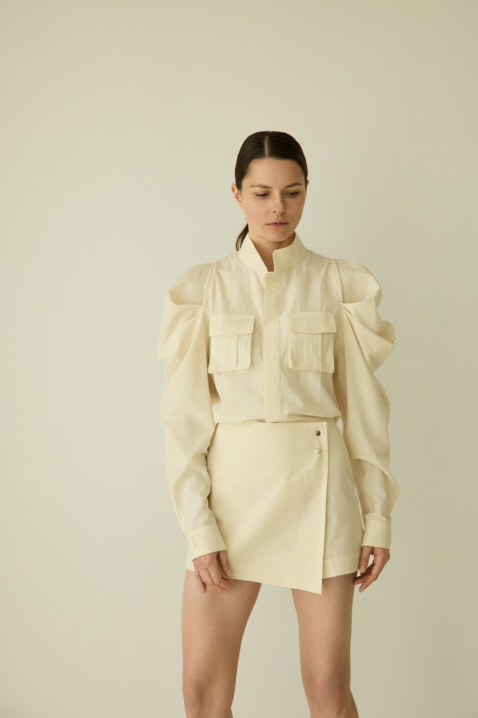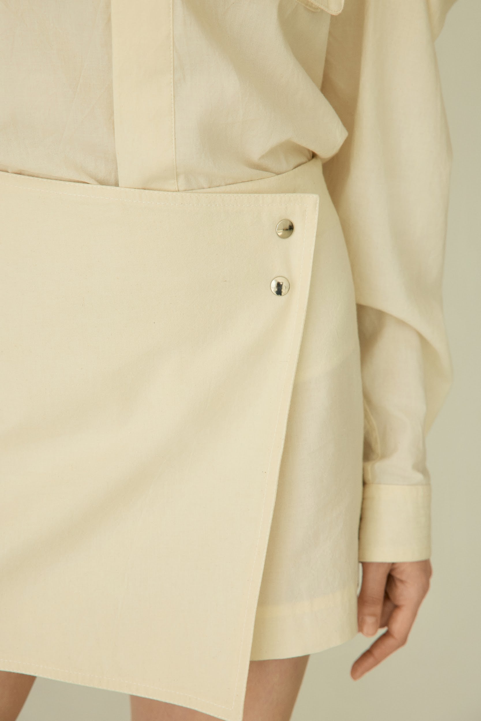 La falda ARI debe su nombre a la persona que inspiró su diseño. Es una pieza de espíritu joven que combina la estética de una falda mini con la funcionalidad de un short, gracias a su patrón interior. Su silueta envolvente, cerrada con botones metálicos, le aporta un toque contemporáneo y resuelto. ARI es una prenda ligera, cómoda y sofisticada que redefine la idea del "skort" con una mirada arquitectónica y limpia.
